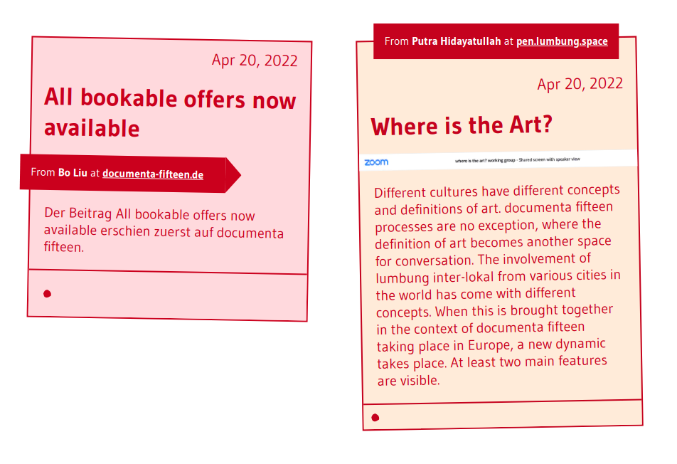 /pen/pulls posts fromcontent/penin hugo and/shouts/pulls from thecontent/shoutsfolderI've created a new partial for pen cards, based on @simoon's design. Now just waiting on some changes to feed.py (ruangrupa/lumbunglib#31) for it to get deployed
